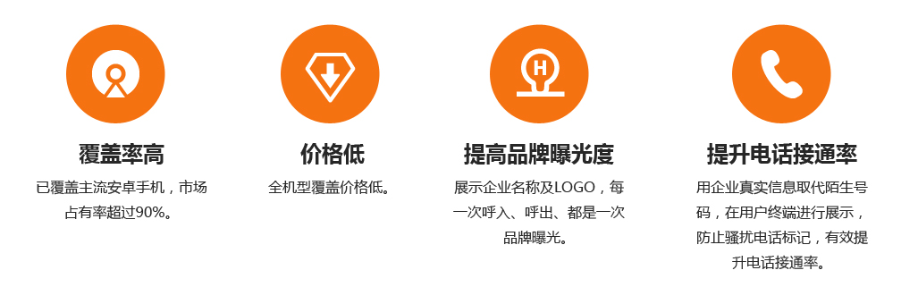 是将企业名称及LOGO在用户手机终端进行统一展示,为企业客户提供企业宣传,品牌输出服务;通过来去电号码与企业名称关联,增强企业号码辨识度,提升品牌曝光量,同时也能完美避免骚扰电话给企业带来的不良影响。